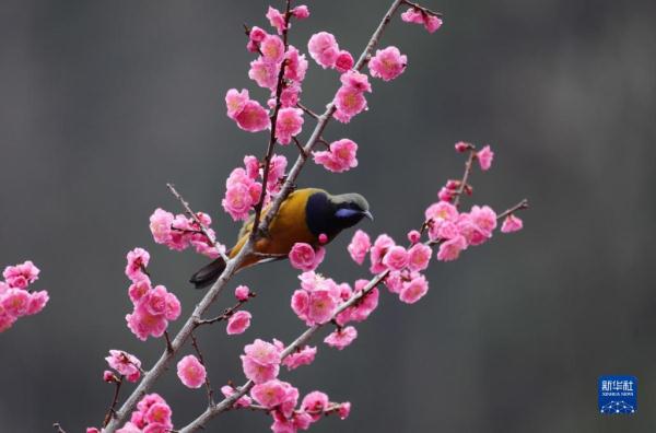 2月23日,在张家界市武陵源区黄龙洞景区,一只小鸟在花枝上停留。