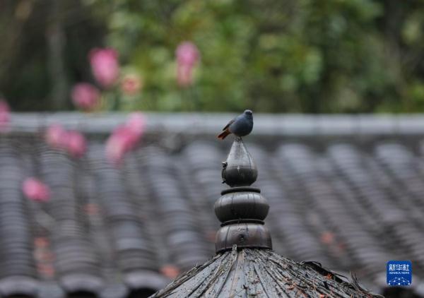 2月23日,在张家界市武陵源区黄龙洞景区,一只小鸟在屋顶上停留。