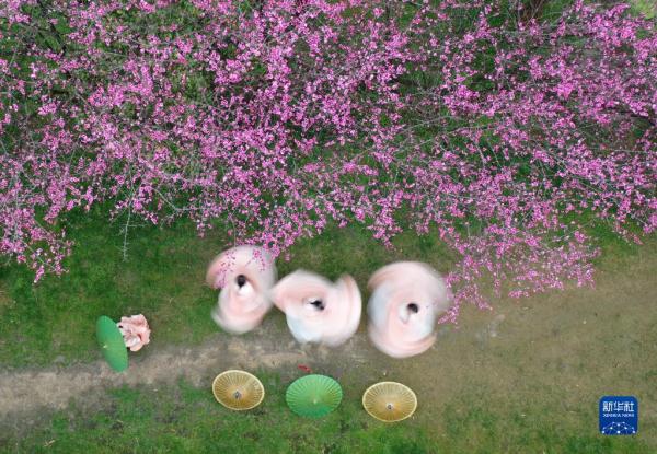 春回大地,在湖南省张家界市武陵源区黄龙洞景区,梅花争艳绽放,春意盎然,吸引人们来到户外踏春赏花,乐享春光。