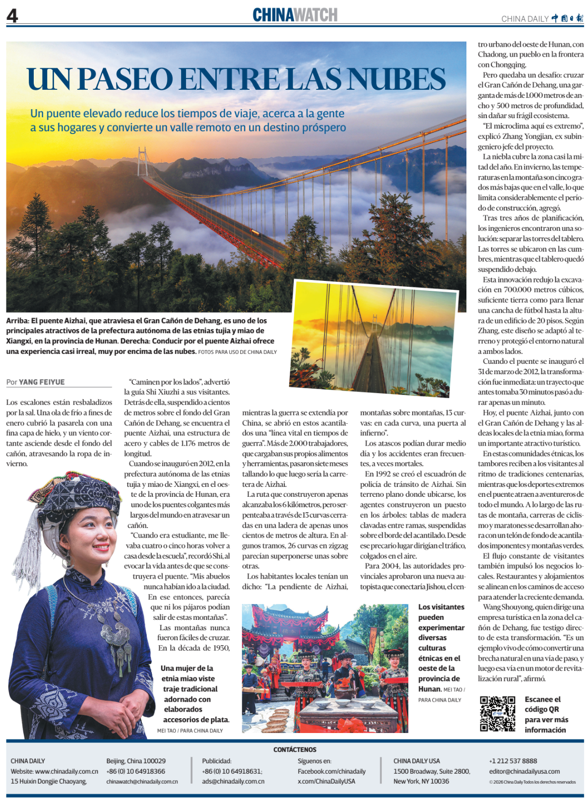 2012年,这座大桥在湖南湘西土家族苗族自治州建成通车,是当时世界上跨峡谷长度最长的悬索桥之一。